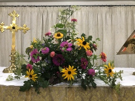 Floral display of orchids and lilies standing on cloths representing the ocean, peaks and resources of Taiwan